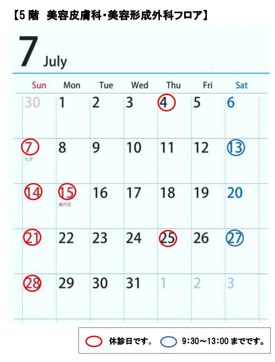 ★休診日 : 【7月】 4、7、14、15、21、25、28